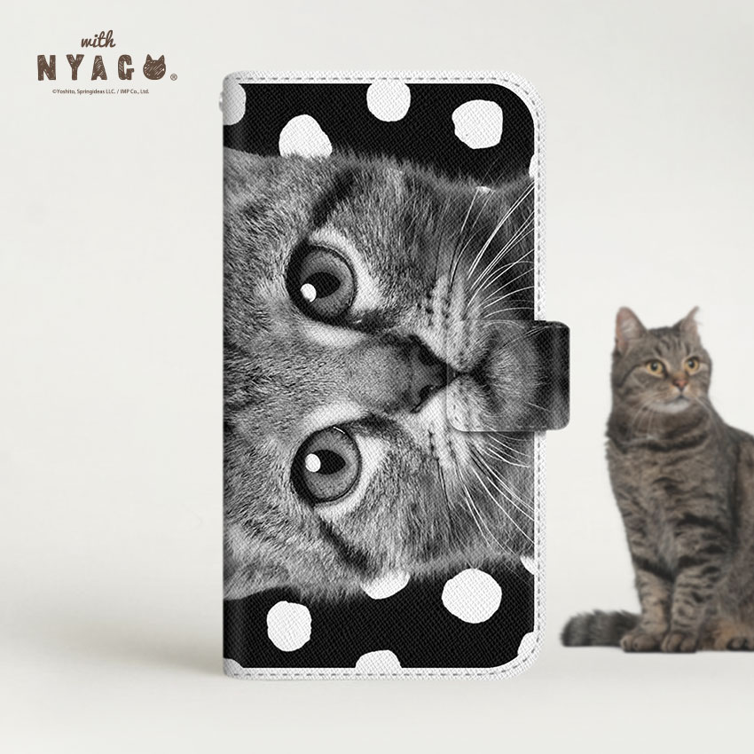 スマホケース 猫 手帳型 全機種対応 厚手【 ソラちゃん 肉球をペロペロするにゃー。 ドット 水玉 かわいい猫】【with NYAGO】ホワイト ドット スマホショルダー ネコ柄 プレゼント スマホケース 猫 柄 iPhone14 スマホケース 猫 可愛い iPhone13
