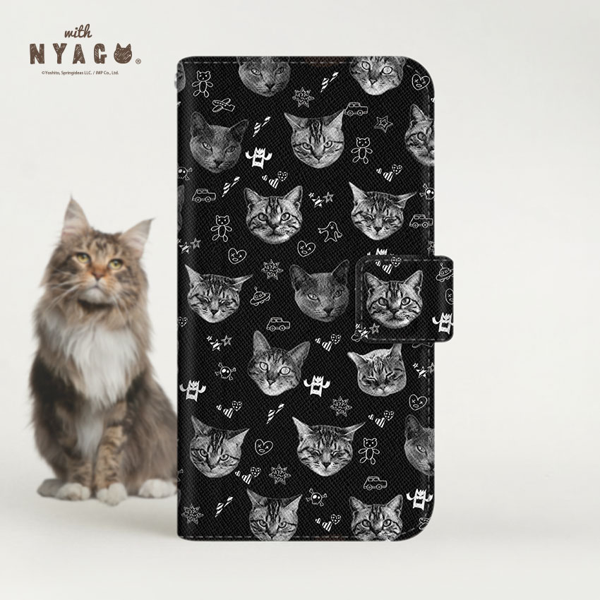 スマホケース 猫 手帳型 全機種対応 薄手【ノート キュート モノクロ キャット 】【with NYAGO】猫フェイス 猫いっぱい スマホケース 猫 iPhone14 iPhoneケース 猫 可愛い スマホショルダー 猫 ネコ柄 動物