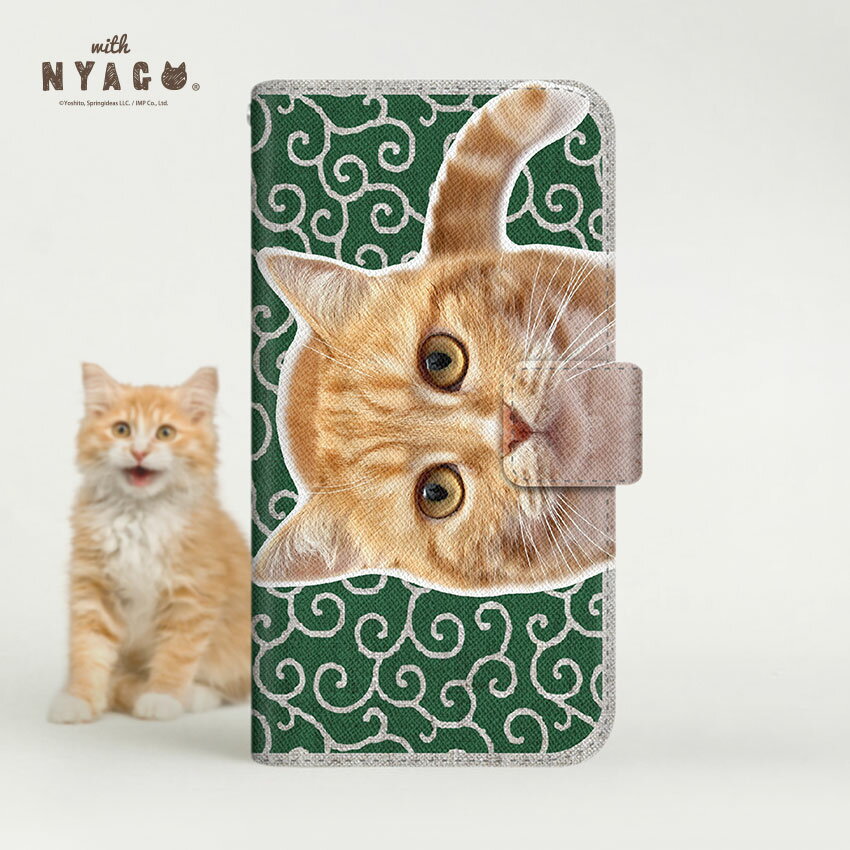 スマホケース 猫 手帳型 全機種対応 薄手【キ甘えんぼう 茶トラ 猫 ペロペロするにゃ〜。 にゃんとも 和風 だにゃ~。】【with NYAGO】唐草模様 緑 かわいい猫 スマホケース 猫 柄 iPhone14 スマホケース 猫 可愛い iPhoneケース 猫 スマホショルダー ネコ柄