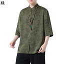 チャイナシャツ 漢服 武術シャツ メンズ 七分袖 茶師服 アイスシルク 竹柄プリント 春夏秋服 通気 着心地良い 吸汗透湿 体型カバー 演舞 武術公演 ウォーキング 日常着用 ファッション 着まわし