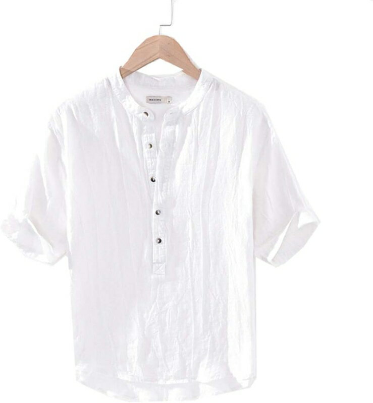 シワ加工シャツ メンズ 夏秋 麻 リネンシャツ ヘンリーネック 細身 カジュアル スリムシャツ おしゃれ レトロ 通気性 ボタンダウンシャツ シンプル スタンドカラー 灰色 柔らかい 白 黒 M-3X