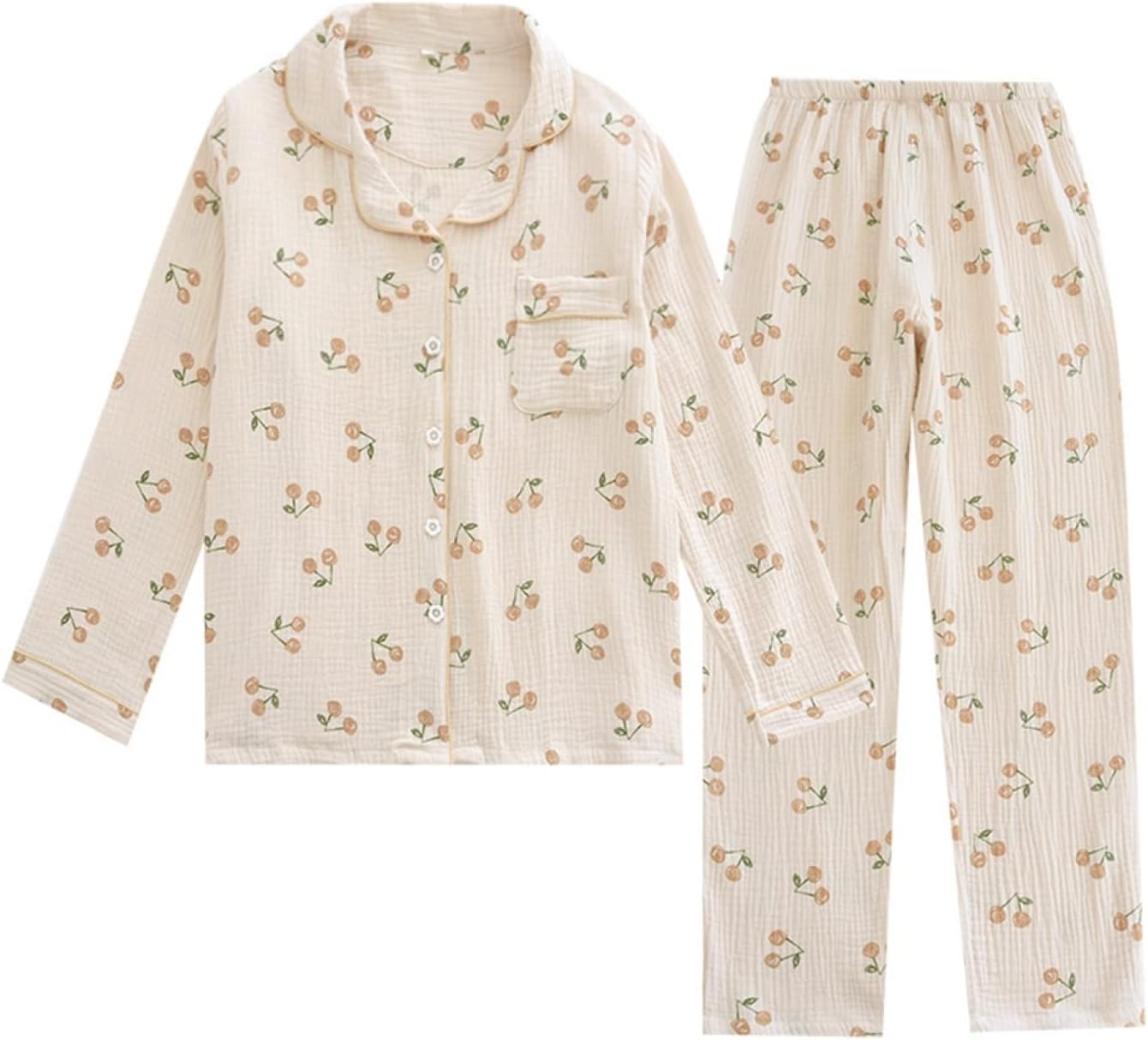 パジャマ レディース 長袖 ダブルガーゼ 春秋 女性 ルームウェア 四季着用 通気吸汗 冷房服 さくらんぼ柄 上下セット 前開き 部屋着 寝間着 可愛い 柔らかい 着心地 ゆったり 和風 便利服 外着