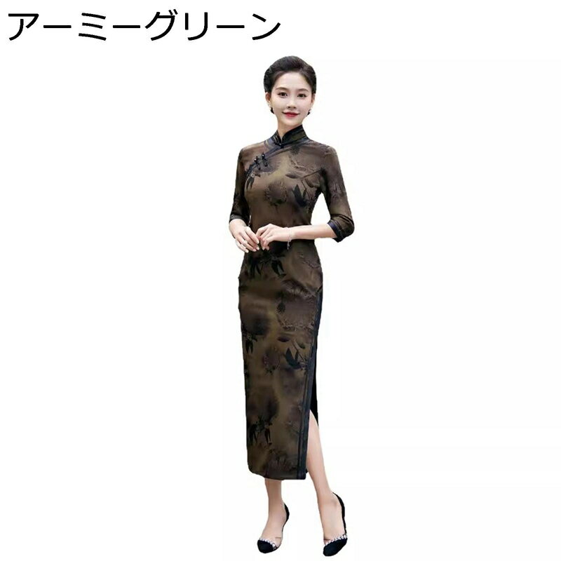 民族衣装 チャイナ服 秋冬 長袖 中華服 ロング丈 竹葉柄 プリント ファッション エレガント 大きいサイズ スリット 着痩せ ドレス チャイナ風 春夏秋 写真?影 日常着用 彼女 宴会