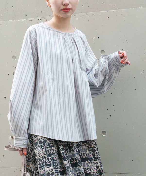 【期間限定P5倍】as know as 放射線ストライプBL レディース トップス ブラウス ブラウス シャツ 前後着用可能 クルーネック 衿風 スリット ボリューム袖 ギャザー ポリエステル ナイロン ポリウレタン ストライプ オフィスカジュアル ドゥバズ